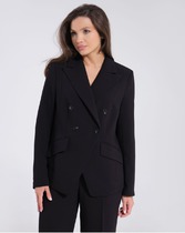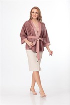 Женский жакет-блуза, прямого силуэта, из хлопковой ткани. Горловина округлой формы, застежка центральная на притачную планку, застегивается на металличесские кнопки. В отрезной части переда обработаны карманы. Спинка цельная. Низ фигурный. В боковых швах разрезы. Рукав втачной, двухшовный, с притачной манжетой, 3/4. Изделие без подкладки. По швам проложены отделочные строчки. Длина рукава 46 см, длина по спинке 86 см.