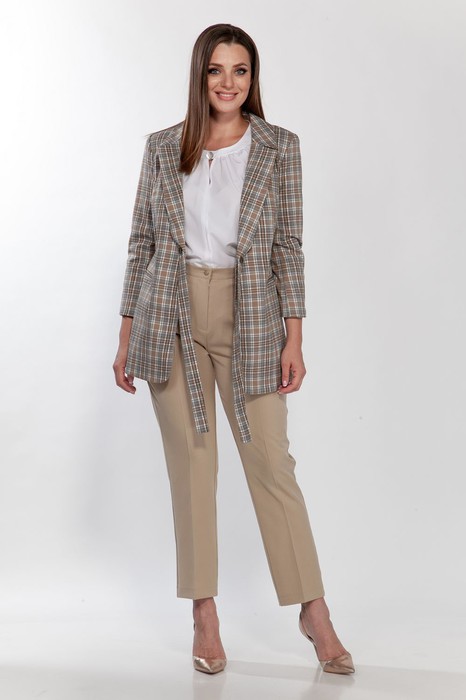 Жакет женский полуприлегающего силуэта выполнен из костюмной ткани в клетку с добавлением эластана на подкладке.  Воротник сложного кроя с завязками и  пуговицами, рукав двухшовный с разрезом, на полочке обработаны функциональные карманы с листочкой. Длина жакета 75 см, длина рукава 53 см.