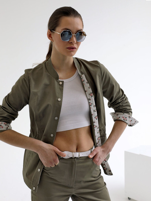Стильный безподкладочный жакет для женщин и девушек любого возраста прекрасно дополнит гардероб на весну и лето. Низ втачного рукава оформлен манжетой. Застежка выполнена в виде  кнопок. Воротник - стойка. Прямой силуэт легко корректируется затяжкой, тем самым подчеркивая линию талии. Карманы прорезные и достаточно удобные. Универсальная длина жакета позволяет сочетать его с брюками, шортами, юбками или платьем. Жакет-куртка из  приятной на ощупь плотной хлопковой ткани - комфортная и практичная одежда для прохладного летнего вечера. В нашей коллекции этот легкий жакет хорошо комплектуется с брюками (арт. 25241), выполненными из такого же хлопка.