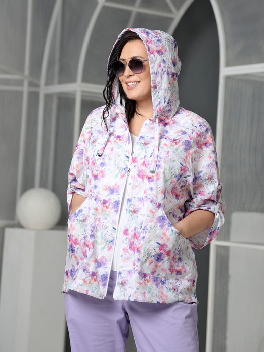 Летний блузон из хлопка с актуальным эффектом вышивки украсит гардероб женщин и девушек любого возраста. Такая легкая курточка прямого силуэта с укороченными рукавами покроя реглан хорошо дополнит образ как с платьем или с юбкой, так и с брюками или с шортами. Застежка на двухзамковую молнию позволяет расстегнуть блузу как сверху, так и снизу. Удобно расположенные втачные карманы подходят для хранения мелочей. Фантазируйте с образами и аксессуарами, и эта стильная курточка выручит Вас летним вечером в городе и на отдыхе.