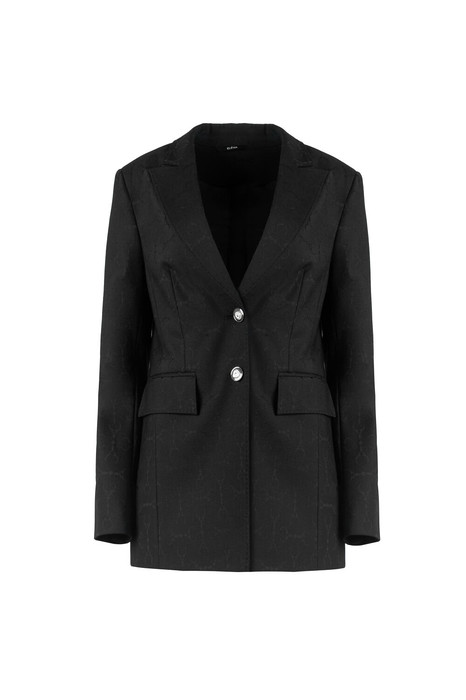 Жакет женский, полуприлегающего силуэта, на подкладке. Застежка на петли и пуговицы. На переде карманы в рамку с клапаном и нагрудный карман листочка с настрочными концами. Рукава втачные, в нижней части локтевого шва отлетная шлица с 3-мя пуговицами и непрорезными петлями. Воротник и лацкана отложные