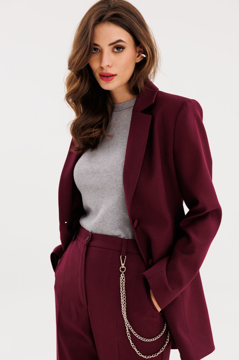 Жакет выполнен из костюмной ткани. Жакет полуприлегающего силуэта, длиной ниже линии бедер. Спереди прорезные карманы с клапанами, центральная бортовая застежка на пуговицы. Воротник пиджачного типа. Рукав втачного покроя, двухшовный. В комплект входит ремень из основной ткани с обтяжной пряжкой.