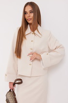 Жакет выполнен из костюмной ткани. Жакет О-образного силуэта, длиной до линии бедер. По переду обработаны рельефы от плечевого шва до низа, прорезные карманы с клапанами, и центральная бортовая застежка на 4 петли и пуговицы. Низ борта округлой формы. На спинке обработаны два рельефа от горловины до низа и средний шов. Горловина округлой формы, обработана цельнокроеным воротником-стойкой. Плечевой шов удлинен. Рукав фигурной формы, двухшовный, заужен к низу. Жакет с плечевыми накладками.