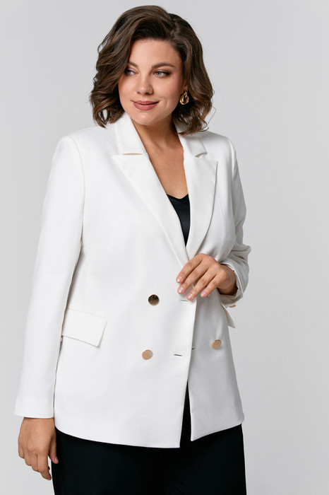 Жакет полуприлегающего силуэта, на подкладке; воротник пиджачного типа; рукава втачные; по переду функциональные прорезные карманы; застежка двубортная на петли и пуговицы.