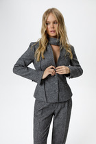 Жакет полуприлегающего силуэта из хлопковой  ткани.  Застежка однобортная на две пуговицы, воротник пиджачного типа.  Перед с талиевой вытачкой, рельефом и декоративным клапаном. Спинка с рельефами из проймы и средним швом.  Рукав втачной двухшовный. Жакет на подкладке. Длина жакета - 68 см, длина рукава жакета - 60 см.