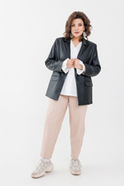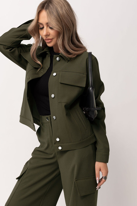 Жакет с центральной застежкой на петли и пуговицы, втачным воротником. Низ жакета с отрезным поясом. Полочки с отрезными кокетками На уровне груди- накладные карманы с клапанами. На уровне бедер- прорезные карманы с листочками. Нижняя часть полочек с двумя рельефными швами от кокетки до пояса. Спинка с отрезной кокеткой, рельефными швами от кокетки до пояса. Рукав втачной, длинный, с отрезной манжетой, застегивающейся на одну петлю и пуговицу.