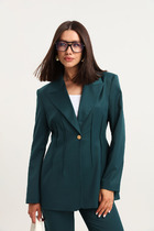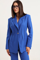 Жакет однобортный умеренного объема, приталенного силуэта. Силуэт изделия создается за счет отрезных бочков на спинке и полочке, а также за счет среднего шва и плечевых вытачек на спинке. На полочке нагрудная вытачка переведена в плечевой шов. Плечевой пояс расширен и поддерживается плечевыми накладками. Рукав втачной, длинный, двухшовный. Воротник отложной с отрезной стойкой, пиджачного типа. Застежка на уровне линии талии на одну петлю и пуговицу. Жакет полностью обработан притачной подкладкой. Длина изделия до середины бедер.  Фурнитура и материалы отделки могут незначительно отличаться от тех, что на фотографи.Рост фотомодели 175 см. Размер у фотомодели – 44.