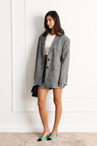 Жакет прямого силуэта. На полочке нагрудная вытачка переведена в прорезной карман. Линия плеч расширена. Рукава втачные, длинные, двухшовные. Воротник отложной, пиджачного типа на отрезной стойке. Однобортная застежка на петли и пуговицы. Отделочные детали из хлопкового полотна по низу рукава и самого изделия создают имитацию рубашки, края не обработаны. Брошь в комплект к жакету не входит.