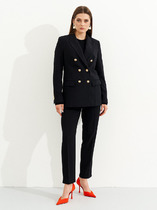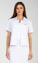 Жакет прямого силуэта, воротник пиджачного типа, рукав одношовный, втачной с незначительно спущенной линией плеча, длиной три четверти, с патой. По линии ткани настрачная кулиса с завязками из основной ткани. Застежка центрально-бортовая. Линия низа верхней части фигурная ассиметричная.
