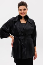 Жакет прямого силуэта, воротник пиджачного типа, рукав одношовный, втачной с незначительно спущенной линией плеча, длинный, с притачной манжетой, декорированной разрезом. По линии ткани настрачная кулиса с завязками из основной ткани. Застежка центрально-бортовая. Линия низа верхней части фигурная ассиметричная.