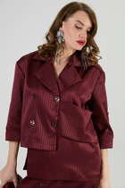 Жакет прямого силуэта с имитацией центральной застёжки на пуговицы. Рукав втачной одношовный, длиной три четверти,застегивающийся на пату. Воротник пиджачного типа . Линия низа фигурная, симметричная . По левому переду расположена декоративная деталь.
