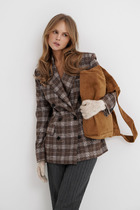 Жакет полуприлегающего силуэта, из костюмной ткани «гусь-лапка», с центральной бортовой застежкой на 4 петли и 4 пуговицы, с воротником пиджачного типа. Длина жакета по среднему шву спинки 66 см от шва втачивания воротника в горловину. Перед с рельефными швами, проходящими через центр груди, идущими от пройм до низа. В нижних частях переда обработаны прорезные карманы с листочкой. В верхней левой части переда расположена имитация прорезного кармана с листочкой. Отлет воротника, лацканы, борта обработаны притачными планками. Спинка со средним швом, с рельефами, идущими от пройм до низа. Рукав втачной, двухшовный, с притачной планкой, имитирующей шлицу по локтевому шву с 3-мя пуговицами, и планкой по низу рукава. Длина рукава 61 см. Притачные планки воротника, лацканов, бортов, рукавов и листочки карманов выполнены из контрастной отделочной ткани. Жакет на подкладке, с плечевыми накладками.