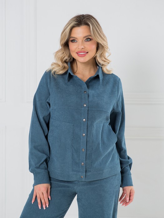 Повседневный жакет прямого силуэта, выполнен из эластичного микровельвета. Жакет по переду с центральной застежкой на кнопки, притачными кокетками и двумя фигурными накладными карманами. По швам притачивания кокеток отделочные строчки. Спинка целая. Горловина переда и спинки с втачным отложным воротником, с цельнокроеной стойкой. Рукав втачной длинный с притачным манжетом по низу. Манжеты застегиваются на две кнопки. Длина рукава от плеча в 48 р-ре – 64 см. в 64 р-ре – 68 см., ширина рукава по низу в 48 р-ре – 24 см. в 64 р-ре – 28 см. Жакет без подклада. Длина изделия по спинке в 48 р-ре – 59 см. в 64 р-ре – 66 см.