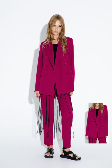 Текстильный классический жакет прямого кроя. Детали: жакет полуприлегающего силуэта, пиджачный воротник, перед с прорезными карманами, двубортная застежка на петли и пуговицы, спинка со средним швом, рукава втачные двухшовные, жакет на подкладке