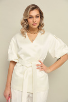 Детали: полуприлегающий силуэт, цельнокроеный воротник-стойка, двубортная застёжка на петли и пуговицы, рельефные швы переда и спинки с декоративным элементом, рукава длинные с вырезами по верху, функциональные карманы, жакет на подкладке.