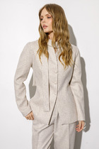 Детали: жакет полуприлегающего силуэта, цельнокроеная стойка, застежка на петли и пуговицы, имитация нагрудного кармана, рукава фигурные длинные с верхним швом и объемными плечевыми накладками, съемный шарфик.