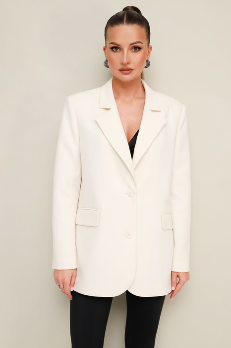Жакет актуального прямого кроя, выполнен из костюмной ткани. Воротник пиджачного типа с отложными лацканами, край борта скругленный по низу жакета. Спереди обработаны прорезные карманы в рамку с клапанами. Рукава втачные двухшовные со шлицей и пуговицами. Спинка со средним швом, переходящим в высокую шлицу с застежкой на петли и пуговицы. Жакет на подкладке.