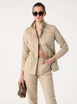 Куртка женская из текстильной ткани (джинс) прямого силуэта. Куртка без подкладки. По переду расположены накладные карманы с клапаном, в боковых подрезах расположены карманы. Спинка с рельефами и кокеткой, плечо спущенное. Рукав двухшовный с манжетой. Вырез горловины обработан воротником. Куртка застегивается на кнопки.
