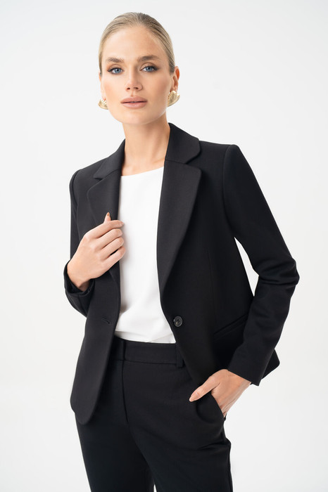 Черный трикотажный жакет – незаменимая вещь на каждый день. Эта модель универсальная, она подойдет любой женщине, независимо от её возраста, предпочитаемого стиля одежды и телосложения. Такую популярность жакет черного цвета приобрел за счет своей уникальной комбинаторности, он легко сочетается с массой вещей. Кроме того, такая модель уместна в любой ситуации. Жакет прекрасно комбинируется с блузой 24-425-1 и является комплектом к брюкам 25-549-1, юбке 25-550-1, платью 25-561-1. Жакет женский полуприлегающего силуэта, выполнен из трикотажного полотна, на подкладке, с воротником пиджачного типа, предназначен для повседневной носки. Перед и спинка с отрезным бочком.