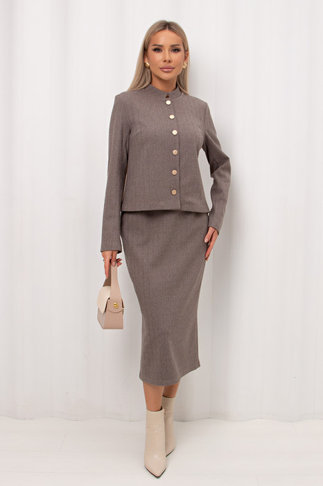 Стильный укороченный жакет прямого кроя из утепленного костюмного трикотажа в ёлочку. Длинный втачной рукав. Горловина оформлена воротником-стойка. По центру переда застежка на петли и пуговицы.