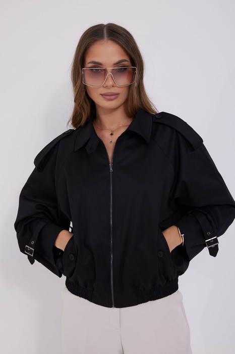 Жакет мягкой формы на молнии. Рукав реглан. Воротник рубашечный. Низ собран на резинку. На переде карманы с клапаном,  погоны с пуговицей. По низу рукава шлевки и пата с застежкой на пряжку. Жакет на подкладке.
