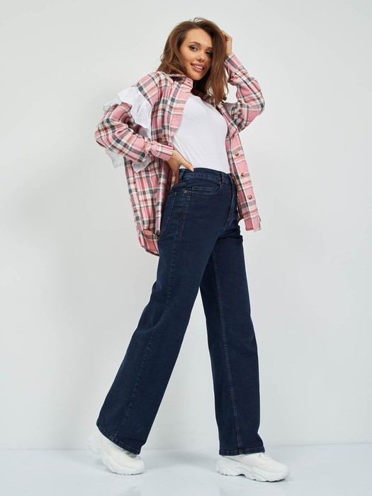 Женские модные джинсы с пятью карманами. Посадка Baggy fit , высокая талия спереди и сзади, широкие штанины по всей длине. для лучшего облегания в области бедер под передними карманами сделана вытачка. Застежка на молнии. Выполнены из эластичной ткани denim stretch, цвет ткани Blue/Black(лицевая сторона ткани темно-синяя, изнаночная сторона-черная). Классическая темная стирка с потёртостями только по швам.