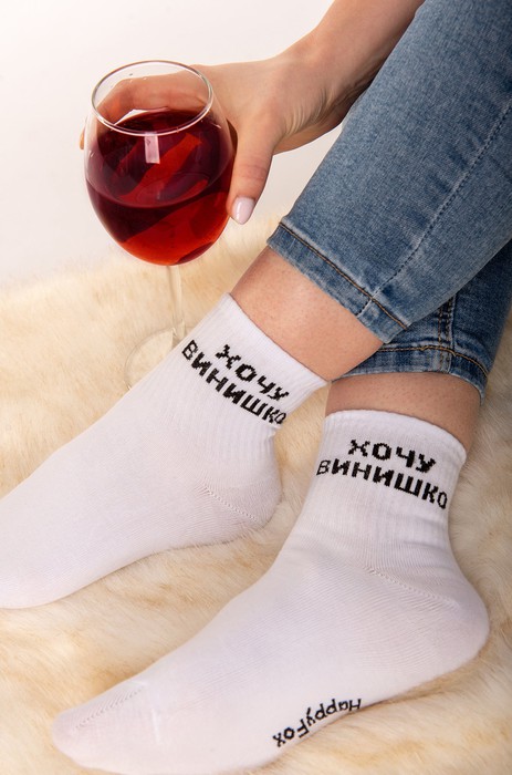 Белые женские носки выполнены из натурального хлопка и украшены прикольной надписью Хочу винишко.