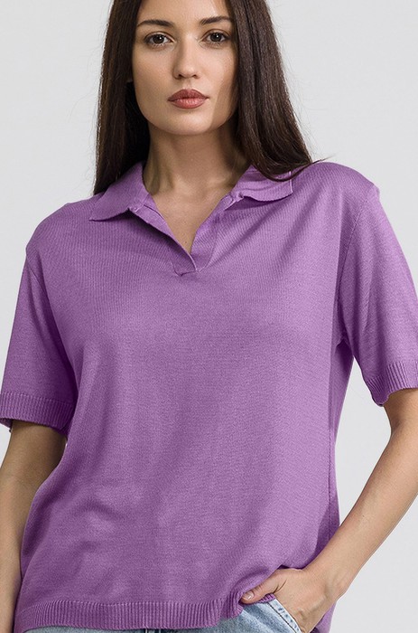 Женская футболка-поло выполнена из нежного вязаного трикотажа. Модель поможет создать крутой кэжуал образ для весны. Футболка для женщин приковывает взгляды благодаря эффектному сочетанию волнующего V-образного выреза и лаконичного отложного воротника. Восхитительный лавандовый оттенок создает атмосферу легкости и романтики.