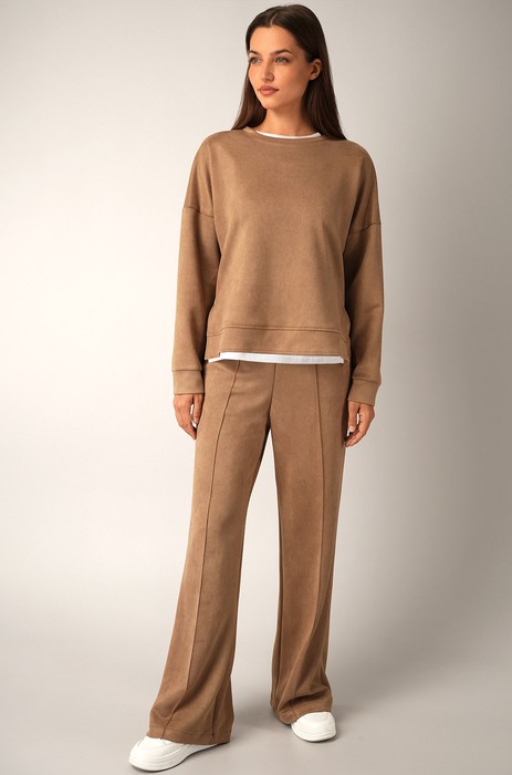 Женский костюм двойка, который влюбляет с первого взгляда! Мягкая экозамша, уютный лонгслив и широкие штаны палаццо создают образ, в котором захочется провести весь день. Универсальный вариант для девушек и женщин, который легко подстраивается под ритм осени и весны.