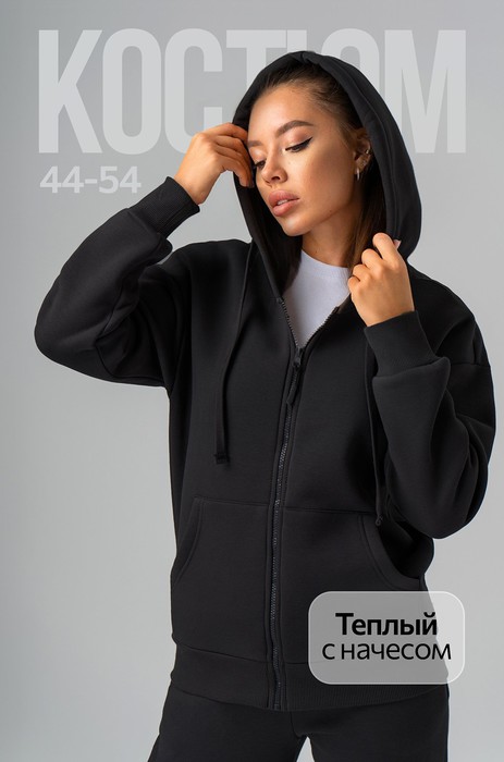 Теплый женский костюм черного цвета выполнен из качественного трикотажа футер с начесом. В комплекте толстовка с объемным регулируемым капюшоном и брюки джоггеры.