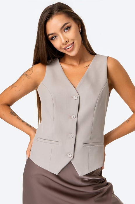 Очарование и изысканность в одном образе! Женский жилет выполнен из костюмной ткани, которая отлично держит форму. Свободная посадка, классическая застежка на пуговицы, базовый бежевый цвет, изящный V-вырез – этот жилет для женщин станет эффектным завершением образа в стиле офис-кор!