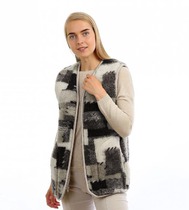 Жилет из текстильного полотна молочного цвета в полоску.Характеристики: подкладка, квадратный вырез горловины, выточки спереди и сзади, застежка центральна на петли пуговички. Длина по спинке 46см.
