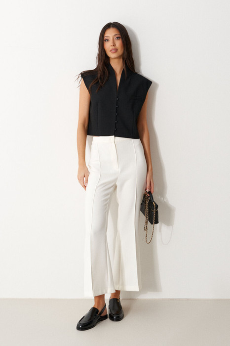 Жилет прямого свободного кроя выполнен из текстильного полотна черного цвета. Характеристики: прямой свободный крой,брендированная подкладка, застежки центральные на петли - пуговицы, декоративный карман. Длина по спинке 41см.