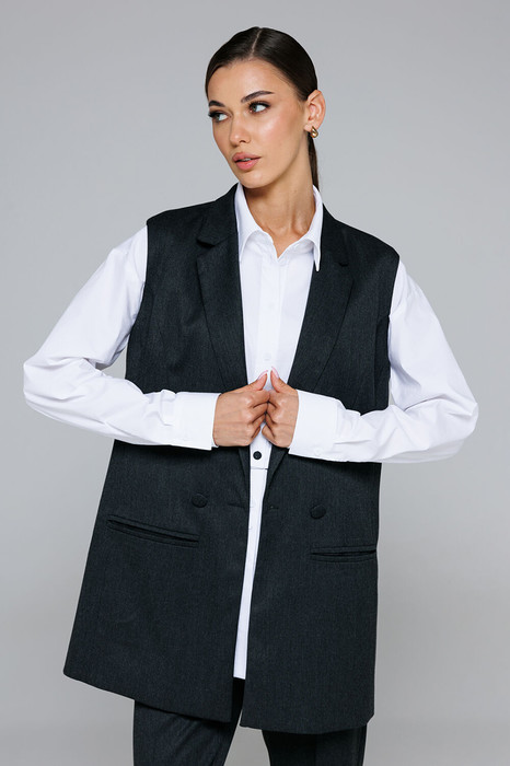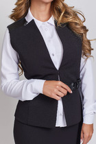 Жилет полуприлегающего силуэта, без рукавов. Полочка с бочком и рельефом, воротник отложной с лацканом, с застежкой на петлю-пуговицу. Карман в рамку. Спинка со средним швом заканчивающимся шлицей и рельефами. Жилет на подкладке.