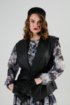 Жилет прямого силуэта без рукавов. Полочка с центральной застежкой на кнопки и карманом-листочкой. Спинка с фигурной кокеткой и рельефами по кокетке, а также с тесьмой от кокетки с логотипом "BUTER". Воротник-стойка. Полочка и спинка с фигурным низом. Полочка, спинка, пройма, воротник окантованы хлопковой тесьмой. Жилет на подкладке.