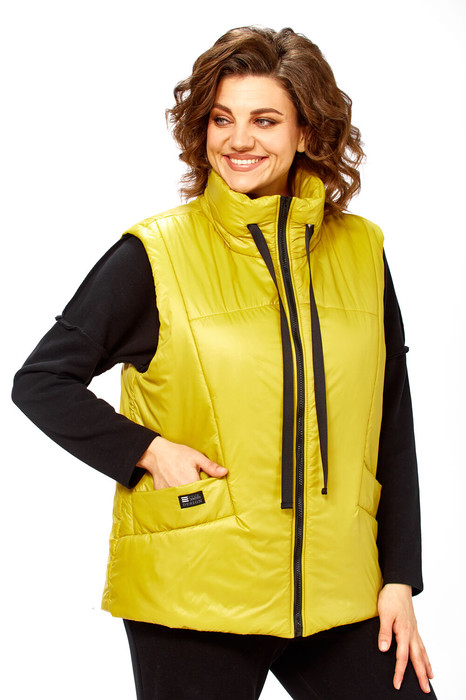 Жилетка женская утепленная с центральной застежкой на "молнию". Спинка со стяжкой. Перед с отрезными бочками и боковыми карманами "с листочкой". Воротник стойка с кулисой и шнуром из декорированной тесьмы. Низ жилетки округлой формы спереди короче, а спинка длиннее . Правый карман украшен нашивкой.