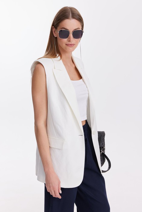 Стильный жилет из льна  актуального кроя для создания современного образа. Жилет из льняной дышащей ткани, на подкладке, полуприлегающего силуэта с центральной застежкой на петли-пуговицы. По переду карманы с клапаном.