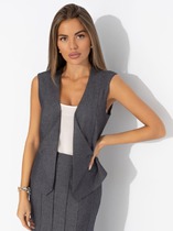 Женский жилет прилегающего силуэта, выполненный на подкладке, идеально подчеркивает фигуру. Передняя часть украшена фиктивными карманами в рамку, а V-образный вырез горловины придает образу элегантность. Застежка расположена по переду и состоит из четырех петель с пуговицами, обеспечивая надежную фиксацию и стильный вид. Спинка оформлена с центральным швом и рельефами, что добавляет изделию изящества и структурности. Этот жилет станет отличным дополнением к любому гардеробу, сочетая комфорт и утонченность.
