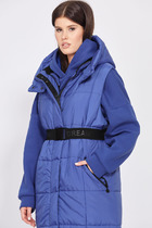 Жилет выполнен  из матовой плащевой ткани, простеганной с изософтом. Жилет прямого силуэта, длиной миди. Спереди застежка на молнию и кнопки на планке. Карманы прорезные, застегивающиеся на молнию. Спинка со средним швом. Воротник-стойка. Капюшон съемный, крепится на пуговицы.  В комплект входит съемный ремень из широкой эластичной тесьмы с пряжкой-карабином. Жилет на притачной по низу подкладке.