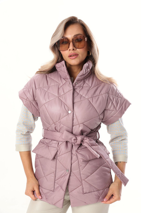 Жилет свободного силуэта из объемной стеганой ткани. Жилет на подкладке. Спущенная линия плеча, застёжка на кнопки. По переду широкие накладные карманы с клапаном с боковым входом для удобства. В комплекте идёт пояс из основной ткани. Длина по спинке 71-73 см.