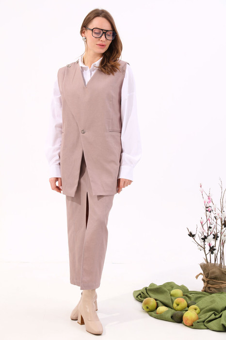 Жилет прямого силуэта оверсайз. По переду талиевая вытачка переходящая в прорезной карман с клапаном и двумя обтачками. Спинка цельнокроенная. Перед фигурный симметричный с застежкой на правом плече на петли и пуговицы. Для дополнительной фиксации по центру застежка на одну петлю и  пуговицу.