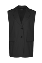 Жилетка полуприлегающего силуэта, длиной чуть выше линии бедер. Жилетка отрезная по линии талии. Лиф спинки и переда с рельефами от пройм до талии. Баска с фигурными подрезами, по переду обработаны карманы. По талии вставлена кулиса, в которую протянута резинка с фиксаторами. По горловине объемная стойка. Линия плеча спущена. по переду застёжка на декоративную тесьму-«молнию». Жилетка на подкладке и утеплена синтепоном.