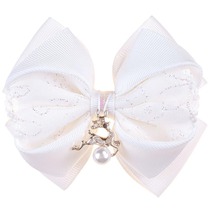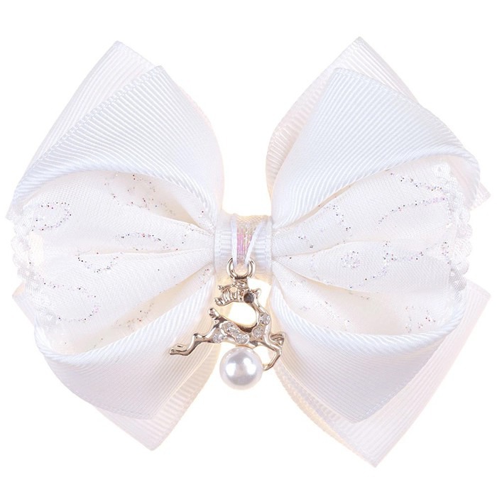 Бант для волос на резинке. Изготовлен из репсовой и капроновой ленты с рисунком из блесток. В центе бантик декорирован фигуркой "Олененок" с крупной жемчужной бусиной. Размер бантика 8 см.