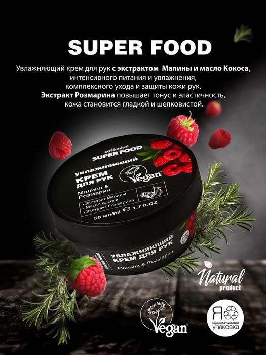 — CAFE MIMI Super food Крем д/рук увлажняющий Малина и Розмарин с маслом Кокоса