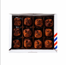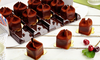 Два слоя шоколадного бисквита, пропитанных вишнёвым сиропом, взбитые сливки и вишнёвый конфитюр. В форме короны из тёмного бельгийского шоколада.