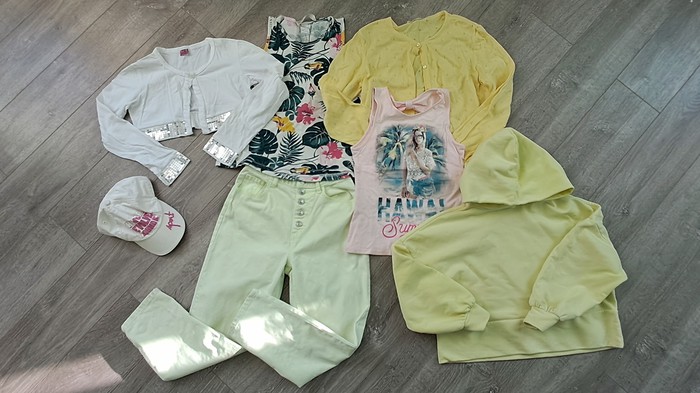 Детская одежда для девочки размером 146-152 см. Одежда восновном в хорошем состоянии, но на джинсах снизу есть непростиранные пятна от чёрной обуви.