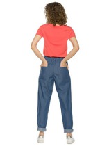 Джинсы слоучи с актуальной высокой посадкой. По спинке резинка для идеального прилегания. Спереди заложены и застрочены складки для комфорта, без лишнего объема. По низу брючин спереди вытачки, создающие форму банан. Полная длина позволяет делать широкую подгибку. 4 кармана.